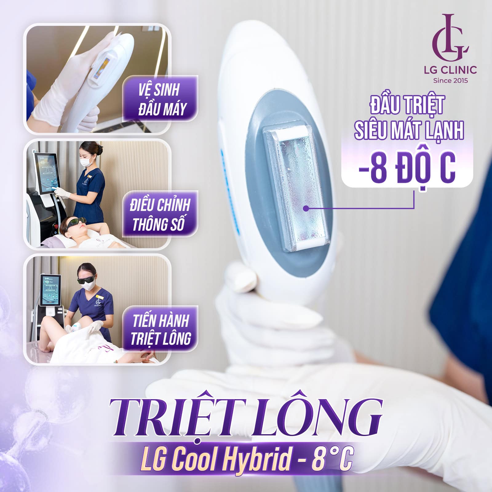 LG Cool Hybrid là công nghệ triệt lông được phát triển bởi đội ngũ kỹ thuật nội bộ của LG Clinic, tích hợp đồng thời hai cơ chế hoạt động trong cùng một hệ thống. Cụ thể, tia laser thế hệ mới giúp tác động sâu đến tận gốc nang lông để ức chế sự phát triển, trong khi hệ thống làm lạnh chủ động giảm nhiệt độ bề mặt da xuống tới –8°C, giúp làm dịu da tức thì và hạn chế tối đa cảm giác bỏng rát thường gặp ở các phương pháp cũ.
