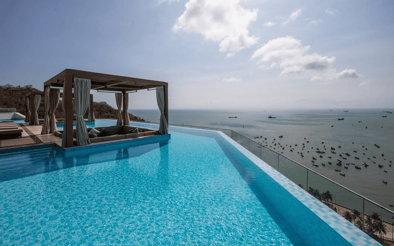 Nếu Malibu mang đến sự tiện nghi hiện đại, Fusion Suites Vũng Tàu lại thu hút nhờ phong cách nghỉ dưỡng kết hợp chăm sóc sức khỏe. Khách sạn sử dụng vật liệu tự nhiên, màu sắc mềm mại và nhiều không gian mở hướng biển. Hồ bơi tầng cao là điểm nhấn thu hút du khách, đặc biệt vào lúc hoàng hôn khi toàn cảnh biển và thành phố hiện lên trọn vẹn.